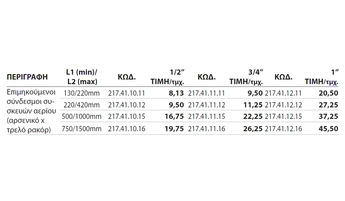 ΕΠΙΜΗΚΟΥΜΕΝΟΙ ΣΥΝΔΕΣΜΟΙ ΣΥΣΚΕΥΩΝ ΑΕΡΙΟΥ (ΑΡΣΕΝΙΚΟ x ΤΡΕΛΟ ΡΑΚΟΡ) ΣΥΛΛΕΚΤΗΣ & ΣΠΙΡΑΛ Φ.Α. – ΥΓΡΑΕΡΙΟΥ